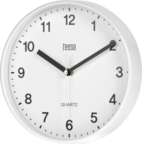 TSA0038 TEESA Falióra, fehér színű 20cmA 20 cm átmérőjű Teesa falióra praktikus és funkcionális megoldás univerzális használatra. Tehát ha érdekli egy falióra konyhába vagy gyerekszobába, irodába vagy nappaliba, a TSA0038 megfelel az elvárásainak. Nagy, jól látható számokA Teesa falióra analóg időkijelző rendszerrel van felszerelve. Fontos, hogy a készülék számlapján egyértelmű órajelzések és pontos percskála található. A nagy és tiszta számjegyek megkönnyítik az idő leolvasását akár távolról is. Kvarc szerkezetA Teesa óra kényelmes és könnyen használható kezelő gombbal rendelkezik, amellyel könnyedén beállíthatja a pontos időt. A mutatók mozgását vezérlő kvarc szerkezet garantálja a pontos időmérést és minimalizálja a kijelzési hibák kockázatát. A Teesa faliórát megkülönböztető pontossága azt jelenti, hogy minden helyzetben megbízhat benne. Akkumulátorral működőA Teesa órának csak egy AA elemre van szüksége a megfelelő működéshez. Ennek köszönhetően nem kell korlátoznia magát, hanem bárhol elhelyezheti a készüléket anélkül, hogy aggódnia kell az elektromos hálózatra való csatlakoztatás miatt. Két szín közül választhatA Teesa TSA0038 kis faliórák tökéletes választás azok számára, akik értékelik az egyszerűséget, a funkcionalitást és az elegáns megjelenést. Annál is inkább, hogy két színváltozat közül választhatsz, fehér és fekete, aminek köszönhetően klasszikus és modern belsőépítészethez is illesztheted az órát.
